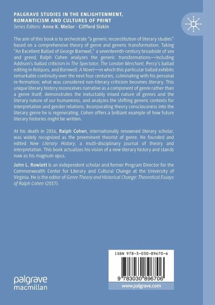 The aim of this book is to orchestrate "a generic reconstitution of literary studies" based on a comprehensive theory of genre and generic transformation. Taking "An Excellent Ballad of George Barnwel," a seventeenth-century broadside of sex and greed, Ralph Cohen analyzes the generic transformations-including Addison's ballad criticism in The Spectator, The London Merchant, Percy's ballad editing in Reliques, and Barnwell. A Novel-in which this particular ballad exhibits remarkable continuity over the next four centuries, culminating with his personal re-formation; what was considered non-literary criticism becomes literary. This unique literary history reconceives narrative as a component of genre rather than a genre itself, demonstrates the ineluctably mixed nature of genres and the literary nature of our humanness, and analyzes the shifting generic contexts for interpretation and gender relations. Incorporating theory consciousness into the literary genre he is regenerating, Cohen offers a brilliant example of how future literary histories might be written.