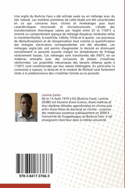 Une argile du Burkina Faso a été utilisée seule ou en mélange avec du talc naturel. Les matières premières de cette étude ont été caractérisées en ce qui concerne leurs chimie et minéralogie puis leurs caractéristiques structurale et microstructurale. L'étude des transformations thermiques subies par l'argile entre 25 et 1100°C a montré un comportement typique de mélange d'espèces minérales telles la montmorillonite, la kaolinite, l'albite, l'illite et le quartz. Les processus de déshydroxylation et de réorganisation tout comme la quantification des énergies d'activation correspondantes ont été abordées. Les mélanges argile-talc ont permis d'augmenter la densité en diminuant sensiblement la porosité ouverte malgré les températures de frittage relativement basses. Ces mélanges sont transformés dès 950°C en un matériau amorphe avec des inclusions de phases cristallines néoformées. Les propriétés mécaniques des tessons obtenus après à 1100°C sont conditionnées par leur nature hétérogène. En particulier la contrainte à rupture, la ténacité et le module de Weibull sont fortement reliés à la prédominance des cristallites formés ou la porosité.