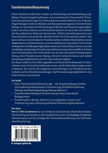Der InhaltWozu Transformationsfinanzierung? - der Zusammenhang zwischen Unternehmenstransformation, Finanzierung, Bonitätseinschätzung (Rating) und Bonitätsgestaltung (Rating Advisory)Transformation Rating als Erweiterung der klassischen Kredit-Ratingsysteme Transformation-Rating-Advisory zur strategischen Analyse und Verbesserung unternehmensspezifischer Finanzierungskonditionen