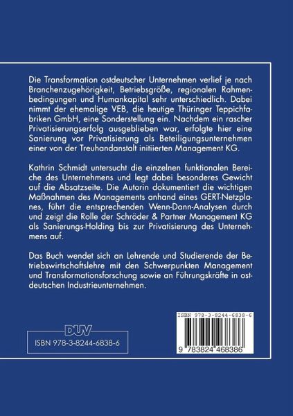 Die Transformation ostdeutscher Unternehmen verlief je nach Branchenzugehörigkeit, Betriebsgröße, regionalen Rahmenbedingungen und Humankapital sehr unterschiedlich. Dabei nimmt der ehemalige VEB, die heutige Thüringer Teppichfabriken GmbH, eine Sonderstellung ein. Nachdem ein rascher Privatisierungserfolg ausgeblieben war, erfolgte hier eine Sanierung vor Privatisierung als Beteiligungsunternehmen einer von der Treuhandanstalt initiierten Management KG. Kathrin Schmidt untersucht die einzelnen funktionalen Bereiche des Unternehmens und legt dabei besonderes Gewicht auf die Absatzseite. Die Autorin dokumentiert die wichtigen Maßnahmen des Managements anhand eines GERT-Netzplanes, führt die entsprechenden Wenn-Dann-Analysen durch und zeigt die Rolle der Schröder & Partner Management KG als Sanierungs-Holding bis zur Privatisierung des Unternehmens auf.