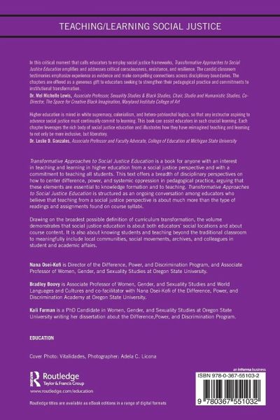 Transformative Approaches to Social Justice Education is a book for anyone with an interest in teaching and learning in higher education from a social justice perspective and with a commitment to teaching all students. This text offers a breadth of disciplinary perspectives on how to center difference, power, and systemic oppression in pedagogical practice, arguing that these elements are essential töknowledge formation and to teaching.¿Transformative Approaches to Social Justice Education is structured as an ongoing conversation among educators whöbelieve¿that teaching from a social justice perspective is about much more than the type of readings and assignments found on course syllabi. Drawing on the broadest possible definition of curriculum transformation, the volume demonstrates that social justice education is about¿both¿educators'¿social locations¿and¿about course content. It is also about knowing students and¿teaching beyond the traditional classroom tömeaningfully¿include local communities, social movements, archives, and colleagues in student and academic affairs.¿ Premised on the notion that continuous learning and growth is critical to educators with deep commitments to fostering critical consciousness through their teaching, Transformative Approaches to Social Justice Education offers interdisciplinary and¿innovative¿collaborative approaches to curriculum transformation that build on and extend existing scholarship on social justice education. Newly committed and established social justice pedagogues share their experiences¿taking up the many difficult questions pertaining to what it means for all of us to participate in shaping a more just, shared future.