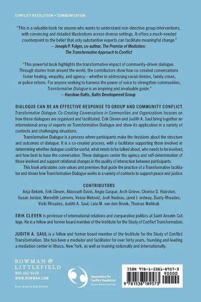 Dialogue can be an effective response to group and community conflict. This book focuses on the many ways of organizing and facilitating transformative dialogue in conflict resolution. Erik Cleven and Judith Saul bring together an international array of experts to provide an introduction to transformative dialogue in conflict resolution work and show its application in a variety of contexts and challenging cases. Transformative dialogue is a process that allows participants to make decisions about the content, process, and outcomes of dialogue, as well as who will participate. It puts the agency and self-determination of participants at the center while allowing facilitators to co-create dialogue with members of organizations and communities. It also centers on the importance of changes in the quality of interaction between participants since these relational changes are at the heart of dialogue. This book articulates core values that guide the practice of a transformative facilitator and shows how transformative dialogue works in a variety of contexts to support peace and justice.