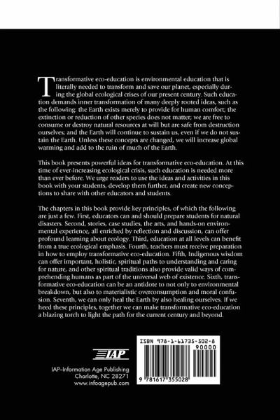 A volume in Transforming Education for the Future Series Editors Jing Lin, University of Maryland and Rebecca Oxford, Air University Transformative eco-education is environmental education that is literally needed to transform and save our planet, especially during the global ecological crises of our present century. Such education demands inner transformation of many deeply rooted ideas, such as the following: the Earth exists merely to provide for human comfort; the extinction or reduction of other species does not matter; we are free to consume or destroy natural resources at will but are safe from destruction ourselves; and the Earth will continue to sustain us, even if we do not sustain the Earth. Unless these concepts are changed, we will increase global warming and add to the ruin of much of the Earth. This book presents powerful ideas for transformative eco-education. At this time of ever-increasing ecological crisis, such education is needed more than ever before. We urge readers to use the ideas and activities in this book with your students, develop them further, and create new conceptions to share with other educators and students. The chapters in this book provide key principles, of which the following are just a few. First, educators can and should prepare students for natural disasters. Second, stories, case studies, the arts, and hands-on environmental experience, all enriched by reflection and discussion, can offer profound learning about ecology. Third, education at all levels can benefit from a true ecological emphasis. Fourth, teachers must receive preparation in how to employ transformative eco-education. Fifth, Indigenous wisdom can offer important, holistic, spiritual paths to understanding and caring for nature, and other spiritual traditions also provide valid ways of comprehending humans as part of the universal web of existence. Sixth, transformative eco-education can be an antidote to not only to environmental breakdown, but also to materialistic overconsumption and moral confusion. Seventh, we can only heal the Earth by also healing ourselves. If we heed these principles, together we can make transformative eco-education a blazing torch to light the path for the current century and beyond.