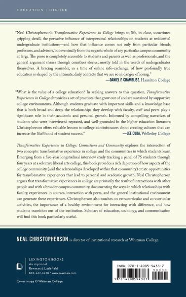 Based on a longitudinal interview study of students at a liberal arts college, this book provides a rich description of how aspects of the college community and how relationships developed within that community create opportunities for transformative experiences that lead to personal and academic growth for students.