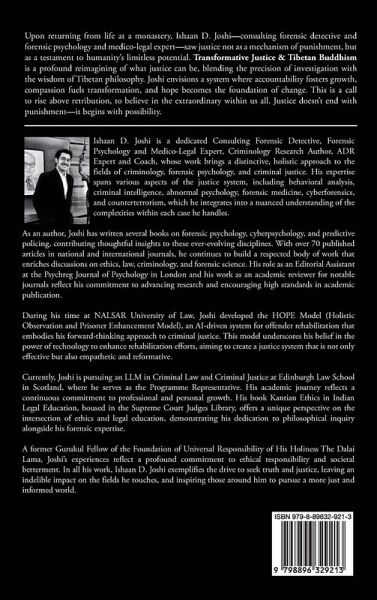 Upon returning from life at a monastery, Ishaan D. Joshi-consulting forensic detective and forensic psychology and medico-legal expert-saw justice not as a mechanism of punishment, but as a testament to humanity's limitless potential. Transformative Justice & Tibetan Buddhism is a profound reimagining of what justice can be, blending the precision of investigation with the wisdom of Tibetan philosophy. Joshi envisions a system where accountability fosters growth, compassion fuels transformation, and hope becomes the foundation of change. This is a call to rise above retribution, to believe in the extraordinary within us all. Justice doesn't end with punishment-it begins with possibility.