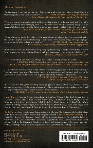 Introduction-Ruth Farmer and Caryn Mirriam-Goldberg A Snake in the Grass: Challenges of Dominant Stories-James SparrellSnapshot: Sherry Reiter Poetry Therapy Pioneer Educator Clinical Social Worker Writer Storyteller Snapshot: Seema Reza Recreational Arts Program Coordinator at Military Hospitals Poet and Writer "Everyone's Life is a Book": Public Housing Women Write for Their Lives-Caryn Mirriam-GoldbergSnapshot: Vanita Leatherwood Writer Facilitator and Director of Sexual Assault and Domestic Violence Center Snapshot: Heather Severson Writer Workshop Model Developer and Facilitator Holding the Space: TLA Values in Education-Ruth FarmerSnapshot: Patricia Fontaine Writer and Facilitator of Workshops for People Living with Cancer Snapshot: Nancy Morgan Arts and Humanities Director at Georgetown Lombardi Comprehensive Cancer Center Youth Writing and Identity: An Interview with Sarah W. BartlettRuth FarmerSnapshot: Suzanne Adams Workshop Facilitator for Adolescent Girls and Writer Snapshot: Minna Dubin Workshop Facilitator for Women and Youth and Writer Zamlers Tricksters and Queers: Re-Mixing Histories in Yiddishland and Faerieland-Ezra Nepon BerkleySnapshot: Miriam Gabriel Blogger and Spoken Word Artist Snapshot: Ruth Gendler Writer Artist and Facilitator of Workshops for Children and Adults Performing for Social Change: Interviews with Kao Kue Taina Asili and Katt Lissard- Ruth FarmerSnapshot: Kelley Hunt Singer-Songwriter International Teaching and Touring Artist Snapshot: Deb Hensley Singer-Songwriter Writer Consultant Facilitator and TLA Network Coordinator Theopoetics as a Spiritual Form of Transformative Language ArtsCallid Keefe-PerrySnapshot: Larry Greer Interfaith Minister and Pastoral Coordinator Snapshot: Joanna Tebbs Young Writer Columnist Expressive Writing and Spirituality Workshop Facilitator and Workshop Developer Women's Self-Leadership Through Transformative Narratives-Yvette Angelique Hyater-AdamsSnapshot: Lisa McIvor Home Health Nurse Workshop Facilitator for People With Disabilities Poet and Writer Snapshot: Jen Cross Writer and Erotic Writer Facilitator of Workshops for Survivors of Sexual Violence and for Erotic Writing Snapshot: Angie River Spoken Word and Burlesque Artist Autobiography of a Social Body-Juliana BorreroSnapshot: Richard Hodgson writer storyteller and workshop facilitator for elders Snapshot: Scott Youmans Seminarian Web Consultant Writer and Facilitator Deep Connection: Healing Self Others and Nature through Transformative Language Arts-Brian W. SunsetResources Contributors & Editors