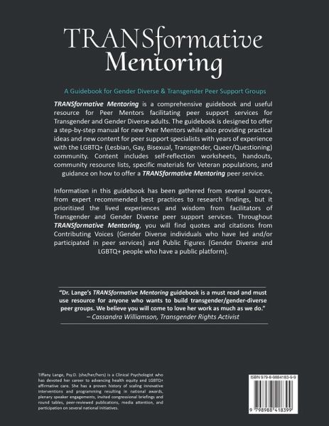 "Dr. Lange's TRANSformative Mentoring Guidebook is a must read and must use resource for anyone who wants to build transgender/gender-diverse peer groups. We believe you will come to love her work as much as we do." - Cassandra Williamson, Transgender Rights Activist Grounded in established research and real-world practice, the TRANSformative Mentoring Guidebook is an essential resource for Peer Mentors providing support services to Gender Diverse and Transgender Adults, with featured content for Veteran Populations. Readers can expect practical suggestions for new Group Leaders and fresh ideas for those with years of experiencing leading peer support services. TRANSformative Mentoring includes easy-to-follow guidance for leading a peer group, reflection worksheets, templates, and over 25 session topics with handouts. The ideas, thoughts, and inspiration for the TRANSformative Mentoring Guidebook come from the experience and expertise of those who have real-world knowledge of Gender Diverse peer support services. Throughout the guidebook, readers will find quotes and citations from Contributing Voices (Gender Diverse individuals who have led and/or participated in peer services) and Public Figures (Gender Diverse and LGBTQ+ people who have a public platform).