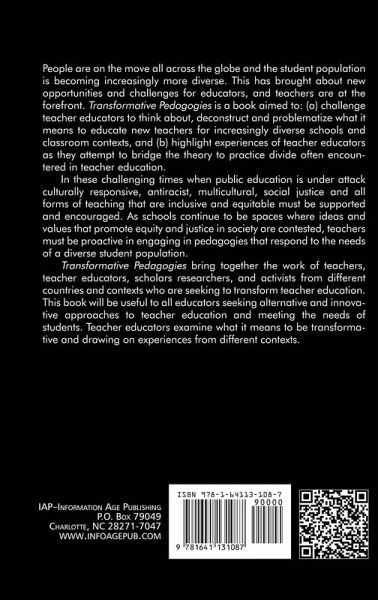 People are on the move all across the globe and the student population is becoming increasingly more diverse. This has brought about new opportunities and challenges for educators, and teachers. In this series teacher educators a) deconstruct and problematize what it means to educate new teachers for increasingly diverse schools and classroom contexts, and b) highlight experiences of teacher educators as they attempt to bridge the theory to practice divide often encountered in teacher education. In these challenging times when public education is under attack, culturally responsive, antiracist, critical multicultural, social justice and all forms of teaching that are inclusive and equitable must be supported and encouraged. As schools continue to be spaces where ideas and values that promote equity and justice in society are contested, teachers must be proactive in engaging in pedagogies that respond to the needs of a diverse student population. Transformative Pedagogies bring together the work of teachers, scholars, and activists from different countries and contexts who are seeking to transform teacher education. This book will be useful to all educators seeking alternative and innovative approaches to education and meeting the needs of students. Teacher educators examine what it means to be transformative and drawing on experiences from different contexts.