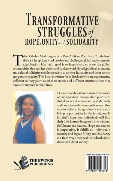 Human mobility allows us to tell the stories of our ancestors. Assimilation postulates that all men and women are created equally and can achieve the same goals as any other race or culture. Integration of every race brings opportunities for the immigrant. It is Tsitsi's hope that individuals will find their life's journey integrated into wisdom, fulfillment and success. Hope and success is imperative. It fulfills an individual's identity and legacy. Unity and Solidarity is a fresh voice that enables individuals to dance and shout victory!
