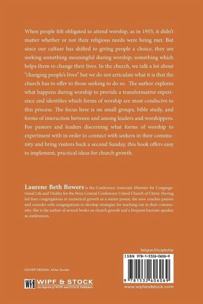 When people felt obligated to attend worship, as in 1955, it didn't matter whether or not their religious needs were being met. But since our culture has shifted to giving people a choice, they are seeking something meaningful during worship; something which helps them to change their lives. In the church, we talk a lot about "changing people's lives" but we do not articulate what it is that the church has to offer to those seeking to do so. The author explores what happens during worship to provide a transformative experience and identifies which forms of worship are most conducive to this process. The focus here is on small groups, bible study, and forms of interaction between and among leaders and worshippers. For pastors and leaders discerning what forms of worship to experiment with in order to connect with seekers in their community and bring visitors back a second Sunday, this book offers easy to implement, practical ideas for church growth.