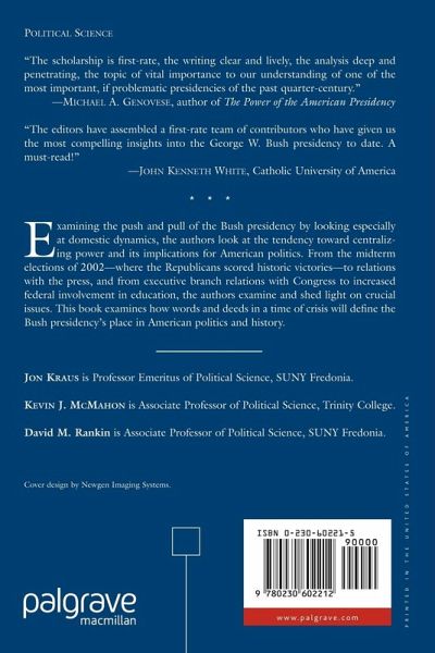 The presidency of George W. Bush has been a curious one: born in contention, challenged by the most dramatic foreign directed attack on American soil, and transformed by a combination of crisis and conflict that has generated considerable support domestically. And yet, while much attention has been focused on the Bush administration's extrernal policies, how it has pursued its goals and had its effects on the domestic scene has been as important. Examining the push and pull of the Bush presidency by looking especially at domestic dynamics, the authors look at the tendency towards centralizing power and its implications for American politics. From the midterm elections of 2002, where the Republicans scored historic victories, to relations with the press, and from executive branch relations with Congress to increased federal involvement in education, the authors examine and shed light on crucial issues. This book examines how words and deeds in a time of crisis will define the Bushpresidency place in American politics and history.