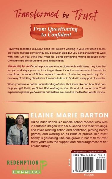 Have you accepted Jesus but don't feel like He's working in your life? Does it seem like you're missing something? You believe in God, but you don't know how to walk with Him. Do you think you must be doing something wrong because other Christians are so secure and bold in their faith? Transformed by Trust can help you see what a closer walk with Jesus may look like for you and steps you can take to get there. It's not a mathematical formula to calculate a number of Bible chapters to read or minutes to pray each day. It's a new way of thinking about what it means to trust in God with every part of your life. When you have a better understanding of what that looks like and how God can help you get there, you'll see God working in your life and all around you. You'll experience joy like you've never had before. You can live the life God wants for you.