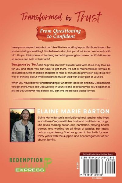 Have you accepted Jesus but don't feel like He's working in your life? Does it seem like you're missing something? You believe in God, but you don't know how to walk with Him. Do you think you must be doing something wrong because other Christians are so secure and bold in their faith? Transformed by Trust can help you see what a closer walk with Jesus may look like for you and steps you can take to get there. It's not a mathematical formula to calculate a number of Bible chapters to read or minutes to pray each day. It's a new way of thinking about what it means to trust in God with every part of your life. When you have a better understanding of what that looks like and how God can help you get there, you'll see God working in your life and all around you. You'll experience joy like you've never had before. You can live the life God wants for you.