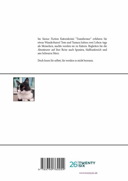 Im Science Fiction Katzenkrimi "Transformer" erfahren Sie etwas Wunderbares! Tom und Tamara haben zwei Leben: tags als Menschen, nachts werden sie zu Katzen. Begleiten Sie die Abenteurer auf ihre Reise nach Spanien, Südfrankreich und ans Schwarze Meer.Doch lesen Sie selbst, Sie werden es nicht bereuen.