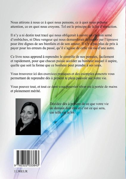 Nous attirons à nous ce à quoi nous pensons, ce à quoi nous prêtons attention et ce que nous tenons pour vrai. Voilà le principe de la loi d'attraction. Ce livre explique comment fonctionne ce processus et comment utiliser le pouvoir de nos pensées pour avoir la possibilité d'être, de faire et d'avoir absolument tout ce que l'on veut. Il permet de comprendre comment nous attirons à nous toutes les expériences de nos vies, les bonnes comme les moins bonnes, ce qui nous donne alors la possibilité de commencer à utiliser délibérément le pouvoir créateur dont nous disposons tous pour reprendre les rênes de notre vie en mains et aller vers la concrétisation de tous nos souhaits, et de la même façon, ne plus avoir à vivre d'expériences indésirables ou douloureuses pour la suite de notre parcours. Cet ouvrage inclut des exercices pratiques et faciles à mettre en application pour que chacun puisse aller vers une satisfaction et une joie plus grandes, quel que soit le domaine de sa vie concerné. Reprenez le contrôle de votre existence dès à présent et accédez enfin au bonheur que vous méritez !