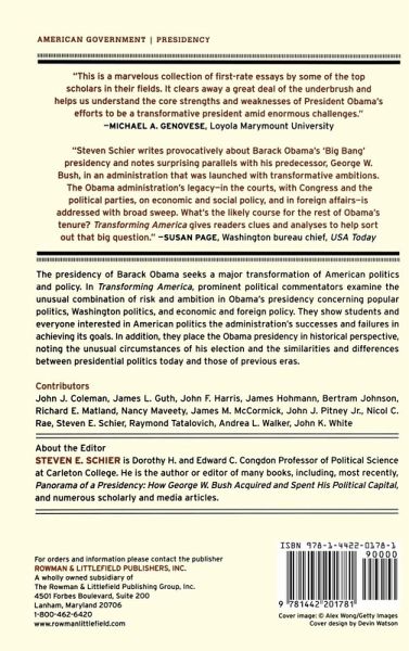 The presidency of Barack Obama seeks a major transformation of American politics and policy. This new collection, edited by Steven E. Schier, examines the unusual combination of risk and ambition in Obama's presidency concerning popular politics, Washington politics, and economic and foreign policy. It also places the Obama presidency in historical perspective, noting the unusual circumstances of his election and the similarities and differences between presidential politics today and those of previous eras. Transforming America: Barack Obama in the White House provides a guiding focus involving the successes and failures of the administration's transformative aspirations during Obama's initial years in the White House.