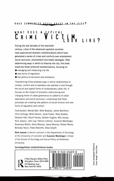 Introduction Transforming Cities Nick Jewson Susanne MacGregor; Part 1 Framing the City; Chapter 1 Contested Cities David Harvey; Chapter 2 The Entrepreneurial City Bob Jessop; Chapter 3 Post-Fordism and Criminality John Lea; Chapter 4 Cool Times for a Changing City Rosemary Mellor; Part 2 Managing and Measuring City Life; Chapter 5 Beyond 'Culture City' Gerry Mooney Mike Danson; Chapter 6 'Race' Housing and The City Peter Ratcliffe; Chapter 7 Violence Space and Gender Jayne Mooney; Chapter 8 Challenging Perceptions Janet Foster; Part 3 New Forms of Regulation: Part nership and Empowerment; Chapter 9 Hegemony and Regime in Urban Governance Chris Collinge Stephen Hall; Chapter 10 Urban Part nerships Economic Regeneration and the 'Healthy City' Mike Sheaff; Chapter 11 Policing Late Modernity Gordon Hughes; Chapter 12 Poverty and Part nership in the Third European Poverty Programme Robert Moore; Part 4 The Politics of Exclusion and Resistance; Chapter 13 Downtown Redevelopment and Community Resistance Mike Beazley Patrick Loftman Brendan Nevin; Chapter 14 Religion Education and City Politics Wendy Ball James A. Beckford; Chapter 15 Poverty Excluded Communities and Local Democracy Mike Geddes;