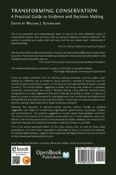 There are severe problems with the decision-making processes currently widely used, leading to ineffective use of evidence, faulty decisions, wasting of resources and the erosion of public and political support. In this book an international team of experts provide solutions. The transformation suggested includes rethinking how evidence is assessed, combined, communicated and used in decision-making; using effective methods when asking experts to make judgements (i.e. avoiding just asking an expert or a group of experts!); using a structured process for making decisions that incorporate the evidence and having effective processes for learning from actions. In each case, the specific problem with decision making is described with a range of practical solutions. Adopting this approach to decision-making requires societal change so detailed suggestions are made for transforming organisations, governments, businesses, funders and philanthropists. The practical suggestions include twelve downloadable checklists. The vision of the authors is to transform conservation so it is more effective, more cost-efficient, learns from practice and is more attractive to funders. However, the lessons of this important book go well beyond conservation to decision-makers in any field.