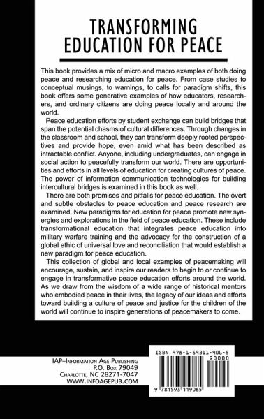 A volume in Peace Education Series Editors:Jing Lin, University of Maryland, Edward J. Brantmeier, Colorado State University, and Ian Harris, University of Wisconsin - Milwaukee Currently, peace education remains marginalized in our education system, however, a united front can be formed and powerful paradigms can empower educators to play a critical role in peace building through scholarship, practice and activism. Indeed, educators around the world are developing effective strategies to transform education as a powerful force for global peace. The diverse array of contributors in the book demonstrate that educators as peace makers can be and have been instrumental in transforming social forces, the self and others for the construction of global peace. The book aims to broaden the educational discourse in order to make room for new visions to educate future generations for peace. Local and global efforts to build a long-lasting peace are presented through the lens of education. The timeliness of peace education surely renders this book relevant to educators and the general public alike as individuals, communities, and organizations struggle to find pathways to peace in a global world. In other words, this book will interest scholars and the general public concerned about the building of global peace. The book can be source book for educators at elementary, secondary, and postsecondary institutions to explore multiple ways to conduct effective peace education at all levels of education. The book may also be used as a textbook by instructors of multicultural education, of comparative & international education, and of undergraduate and graduate peace education courses.