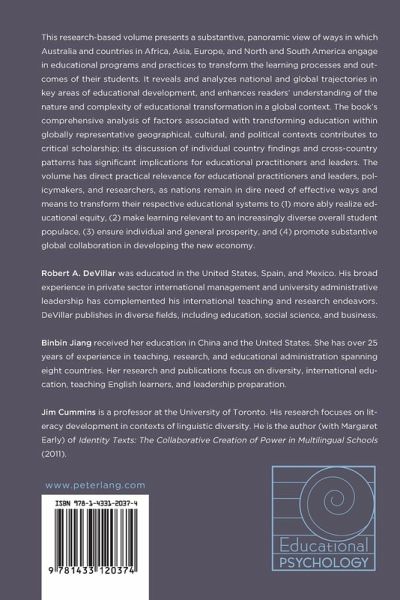 Contents: Jim Cummins: The Role of Research on Literacy, Poverty, and Diversity in Transforming Schools: A Critical Analysis of PISA Cross-National Findings - Daniel Light: Multiple Paths to the 21st Century: National Responses to Enhancing Education with ICTs in Chile, India, and Turkey - Debra L. Panizzon/Mark Ward/Martin Westwell: Transforming Education by Contextualizing Professional Learning for Teachers: A Case in Science and Mathematics in Australia - Hannele Niemi: What Can We Do Even Better? Research for Promoting Quality in Teacher Education in Finland - Heng Jiang: Transforming Teacher Education for Social Equity in China - Yee Han (Peter) Joong/Kathryn Noel: The Perceptions of Teachers in Sierra Leone's Secondary Education Reform - Henan Cheng: Compulsory Education for Migrant Children in China: Issues in Educational Quality - Binbin Jiang/Robert A. DeVillar: The Effects of Student Teaching Abroad on Professional Development, Character Formation, and Cultural Responsiveness - Sohyun An: Transforming Education in South Korea: Currents in Critical Perspective - Srikala Naraian/Poonam Natarajan: Accessing Inclusive Education: Family Stories from India - Lee Hean Lim/Zhi Quan Lim: Networking and Transformation: School Leadership Programs and Practices in Singapore - Robin R. Dada: Leading for Educational Revolution in the United Arab Emirates: Remapping Culture, Educational Outcomes, and Paradigm Shift.