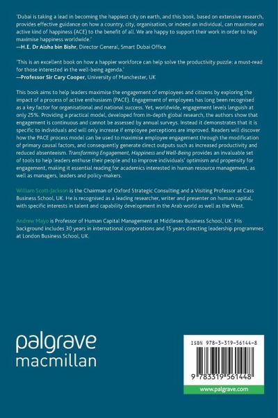 This book aims to help leaders maximise the engagement of employees and citizens by exploring the impact of a process of active enthusiasm (PACE). Engagement of employees has long been recognised as a key factor for organisational and national success. Yet, worldwide, engagement levels languish at only 25%. Providing a practical model, developed from in-depth global research, the authors show that engagement is continuous and cannot be assessed by annual surveys. Instead it demonstrates that it is specific to individuals and will only increase if employee perceptions are improved. Readers will discover how the PACE process model can be used to maximise employee engagement through the modification of primary causal factors, and consequently generate direct outputs such as increased productivity and reduced absenteeism. Transforming Engagement and Wellbeing provides an invaluable set of tools to help leaders enthuse their people and to improve individuals' optimism and propensity for engagement, making it essential reading for academics interested in human resource management, as well as managers, leaders and policy-makers.