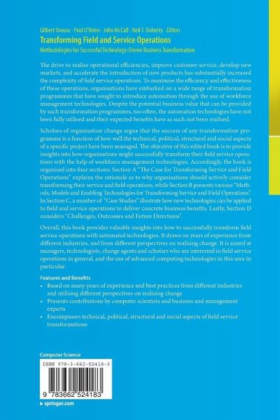 Scholars of organisation change argue that the success of any transformation programme is a function of how well the technical, political, structural and social aspects of a specific project have been managed. The objective of this edited book is to provide insights into how organisations might successfully transform their field service operations with the help of workforce management technologies. Accordingly, the book is organised into four sections: Section A "The Case for Transforming Service and Field Operations" explains the rationale as to why organisations should actively consider transforming their service and field operations, while Section B presents various "Methods, Models and Enabling Technologies for Transforming Service and Field Operations". In Section C, a number of "Case Studies" illustrate how new technologies can be applied to field and service operations to deliver concrete business benefits. Lastly, Section D considers "Challenges, Outcomes and Future Directions".