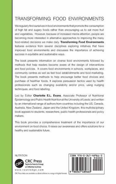 We regularly find ourselves in food environments that promote the consumption of high fat and sugary foods rather than encouraging us to eat more fruit and vegetables. However, because of increased media attention, people are becoming more interested in alternative approaches to improving the many food-related decisions we make daily. Transforming Food Environments features evidence from several disciplines exploring initiatives that have improved food environments and discusses the importance of achieving success in equitable and sustainable ways. The book presents information on diverse food environments followed by methods that help readers become aware of the design of interventions and food policies. It covers food environments in schools, workplaces, and community centres as well as fast food establishments and food marketing. The book presents methods to help encourage better food choices and purchase of healthier foods. It explores persuasion tactics used by health professionals such as changing availability and/or price, using nudging techniques, and food labelling. Led by Editor Charlotte Evans, Associate Professor of Nutritional Epidemiology and Public Health Nutrition at the University of Leeds; and written by an international range of authors from countries including the US, Canada, Australia, New Zealand, Japan and the United Kingdom, this multidisciplinary book appeals to students, researchers, public health professionals and policy makers. It also raises awareness and provides a comprehensive treatment of the importance of our environments on food choice.