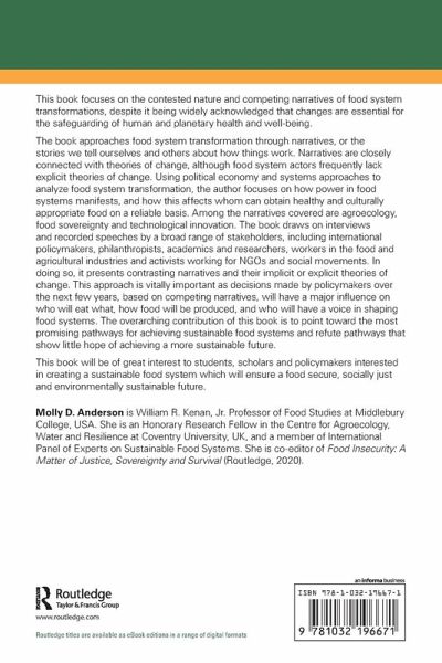 The book approaches food system transformation through narratives, or the stories we tell ourselves and others about how things work. Narratives are closely connected with theories of change, although food system actors frequently lack explicit theories of change. Using political economy and systems approaches to analyze food system transformation, the author focuses on how power in food systems manifests, and how this affects whom can obtain healthy and culturally appropriate food on a reliable basis. Among the narratives covered are agroecology, food sovereignty and technological innovation. The book draws on interviews and recorded speeches by a broad range of stakeholders, including international policymakers, philanthropists, academics and researchers, workers in the food and agricultural industries and activists working for NGOs and social movements. In doing so, it presents contrasting narratives and their implicit or explicit theories of change. This approach is vitally important as decisions made by policymakers over the next few years, based on competing narratives, will have a major influence on who will eat what, how food will be produced, and who will have a voice is shaping food systems. The overarching contribution of this book is to point toward the most promising pathways for achieving sustainable food systems and refute pathways that show little hope of achieving a more sustainable future.