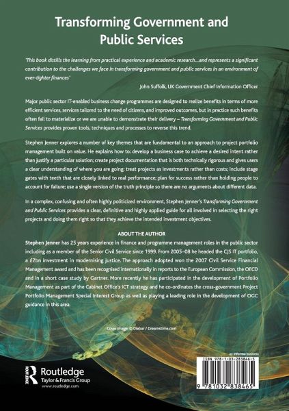 'This book distills the learning from practical experience and academic research...and represents a significant contribution to the challenges we face in transforming government and public services in an environment of ever-tighter finances' " John Suffolk, UK Government Chief Information Officer Major public sector IT-enabled business change programmes are designed to realize benefits in terms of more efficient services, services tailored to the need of citizens, and improved outcomes, but in practice such benefits often fail to materialize or we are unable to demonstrate their delivery - Transforming Government and Public Services provides proven tools, techniques and processes to reverse this trend. Stephen Jenner explores a number of key themes that are fundamental to an approach to project portfolio management built on value. He explains how to: develop a business case to achieve a desired intent rather than justify a particular solution; create project documentation that isboth technically rigorous and gives users a clear understanding of where you are going; treat projects as investments rather than costs; include stage gates with teeth that are closely linked to real performance; plan for success rather than holding people to account for failure; use a single version of the truth principle so there are no arguments about different data. In a complex, confusing and often highly politicized environment, Stephen Jenner's Transforming Government and Public Services provides a clear, definitive and highly applied guide for all involved in selecting the right projects and doing them right so that they achieve the intended investment objectives.