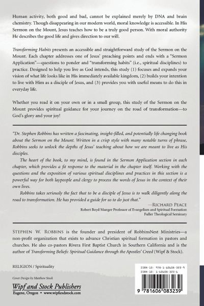 Human activity, both good and bad, cannot be explained merely by DNA and brain chemistry. Though disappearing in our modern world, moral knowledge is accessible. In His Sermon on the Mount, Jesus teaches how to be a truly good person. With moral authority He describes the good life and gives direction to our will. Transforming Habits presents an accessible and straightforward study of the Sermon on the Mount. Each chapter addresses one of Jesus' preaching points and ends with a ""Sermon Application""--questions to ponder and ""transforming habits"" (i.e., spiritual disciplines) to practice. Designed to help you live as God intends, this study (1) focuses and expands your vision of what life looks like in His immediately available kingdom, (2) builds your intention to live with Him as a disciple of Jesus, and (3) provides you with useful means to do this in everyday life. Whether you read it on your own or in a small group, this study of the Sermon on the Mount provides spiritual guidance for your journey on the road of transformation--to God's glory and your joy!