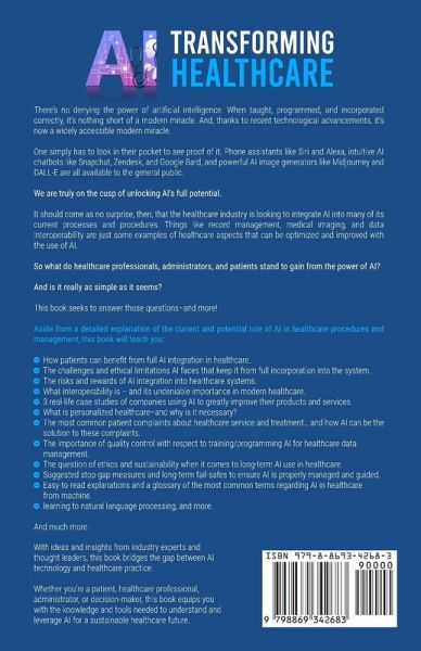 Book Description If you have followed the news at all over the last 12 months, you will have seen many articles on artificial intelligence. It's been the talk of the tech world for a long time now, with many people debating its role in our society and its many potential benefits and disadvantages. But one thing that many people have not discussed is the impact that it might have on our healthcare system and the healthcare systems around the world. That is, until now. Introducing Transforming Healthcare, an in-depth dive into how we can harness the power of artificial intelligence for enhanced patient care. Like most of the Western world, our healthcare system has certainly seen better days, with plenty of hurdles to overcome when experiencing it through the eyes of a patient. Not to mention the fact that healthcare has notoriously always been slow at taking advantage of new technological opportunities. But with the introduction of recent AI advancements, now is the perfect time to start integrating this new technology into our healthcare system to begin reaping the rewards as soon as possible. Inside Transforming Healthcare, discover: ¿ the current landscape of technology in healthcare ¿ the untapped potential of AI in healthcare ¿ how AI can help personalize patient care further, improving the experience ¿ the current limitations of AI in healthcare to be conscious of ¿ how we can move toward an AI-focused healthcare system AI is not going anywhere, and it is only going to improve. It's time for us to embrace the change and use it to our advantage in healthcare.