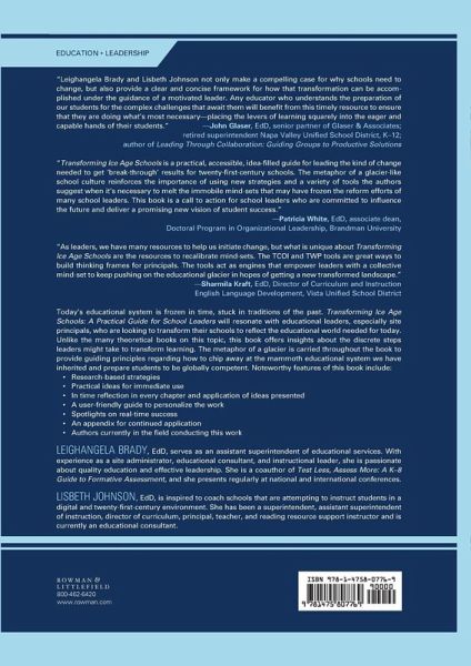 Today’s educational system is frozen in time, stuck in traditions of the past. Transforming Ice Age Schools: A Practical Guide for School Leaders will resonate with educational leaders, especially site principals, who are looking to transform their schools to reflect the educational world needed for today. Unlike the many theoretical books on this topic, this book offers insights about the discreet steps leaders might take to transform learning.