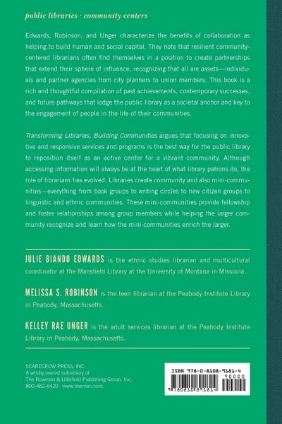 This book is for those moving their library beyond places to find information. Written by practicing public librarians and an academic librarian with an interest in public libraries, the book focuses on how public libraries can become more community centered and, by doing so, how they can transform both themselves and their communities. The authors argue that focusing on building community through innovative and responsive services and programs will be the best way for the public library to reposition itself in the years to come.
