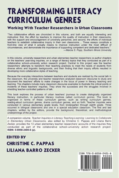In this volume, university researchers and urban elementary teacher-researchers coauthor chapters on the teachers' year-long inquiries, on a range of literacy topics that they conducted as part of a collaborative school-university action research project. Central to this project was the teacher-researchers' attempts to transform their teaching practices to meet the needs of students from diverse ethnic and linguistic backgrounds, and their finding that their inquiry efforts resulted in developing more collaborative styles of teaching. Because the everyday interactions between teachers and students are realized by the social talk in the classroom, the university- and teacher-researchers analyzed classroom discourse to study and document the teachers' efforts to make changes in the locus of power in literacy teaching and learning. The chapters include many classroom discourse examples to illustrate the critical points or incidents of these teachers' inquiries. They show the successes and the struggles involved in shedding teacher-controlled patterns of talk. This book explores the process of urban teachers' journeys to create dialogically organized literacy instruction in particular literacy routines--called, in this book, curriculum genres. The book is organized in terms of these curriculum genres, such as writing curriculum genres, reading-aloud curriculum genres, drama curriculum genres, and so forth. Teacher inquiries were conducted in various elementary grade levels, from kindergarten through grade eight. Three occurred in bilingual classrooms and one in a special education classroom. The first and last chapters, written by the editors, provide the background, theoretical, and methodological underpinnings of the project.