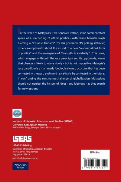 In the wake of Malaysia's 13th General Election some commentators speak of a sharpening of ethnic politics - with Prime Minister Najib blaming a "Chinese tsunami" for his government's polling setbacks; others are optimistic about the arrival of a new "non-racialized form of politics" and the emergence of "transethnic solidarity". This book, which engages with both the race paradigm and its opponents, warns that change is likely to come slowly - but is not impossible. Malaysia's race paradigm is a man-made ideological construct - one that has been contested in the past, and could realistically be contested in the future. In confronting the continuing challenge of globalization, Malaysians should not neglect the history of ideas - and ideology - as they search for new options.