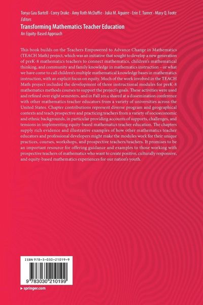This book builds on the Teachers Empowered to Advance Change in Mathematics (TEACH Math) project, which was an initiative that sought to develop a new generation of preK-8 mathematics teachers to connect mathematics, children's mathematical thinking, and community and family knowledge in mathematics instruction - or what we have come to call children's multiple mathematical knowledge bases in mathematics instruction, with an explicit focus on equity. Much of the work involved in the TEACH Math project included the development of three instructional modules for preK-8 mathematics methods courses to support the project's goals. These activities were used and refined over eight semesters, and in Fall 2014 shared at a dissemination conference with other mathematics teacher educators from a variety of universities across the United States. Chapter contributions represent diverse program and geographical contexts and teach prospective and practicing teachers from a variety of socioeconomic and ethnic backgrounds, in particular providing accounts of supports, challenges, and tensions in implementing equity-based mathematics teacher education. The chapters supply rich evidence and illustrative examples of how other mathematics teacher educators and professional developers might make the modules work for their unique practices, courses, workshops, and prospective teachers/teachers. It promises to be an important resource for offering guidance and examples to those working with prospective teachers of mathematics who want to create positive, culturally responsive, and equity-based mathematics experiences for our nation's youth.