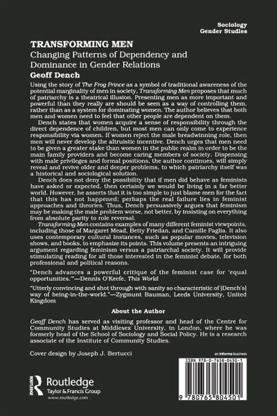 Using the storyThe Frog Princeas a symbol of traditional awareness of the potential marginality of men in society,Transforming Menproposes that much of patriarchy is a theatrical illusion. Presenting men as more important and powerful than they really are should be seen as a way of controlling them, rather than as a system for dominating women. The author believes that both men and women need to feel that other people are dependent on them. Dench states that women acquire a sense of responsibility through the direct dependence of children, but most men can only come to experience responsibility via women. If women reject the male breadwinning role, then men will never develop the altruistic incentive. Dench urges that men need to be given a greater stake than women in the public realm in order to be the main family providers and become caring members of society. Dispensing with male privileges and formal positions, the author continues, will simply reveal and revive older and deeper problems, to which patriarchy itself was a historical and sociological solution. Dench does not deny the possibility that if men did behave as feminists have asked or expected, then certainly we would be living in a far better world. However, he asserts that it is too simple to just blame men for the fact that this has not happened; perhaps the real failure lies in feminist approaches and theories. Thus, Dench persuasively argues that feminism may be making the male problem worse, not better by insisting on everything from absolute parity to role reversal. Transforming Mencontains examples of many different feminist viewpoints, including those of Margaret Mead, Betty Friedan, and Camille Paglia. It also uses contemporary cultural instances, such as popular movies, television shows, and books, to emphasize its points. This volume presents an intriguing argument regarding feminism versus a patriarchal society. It will provide stimulating reading for all those interested in the feminist debate.