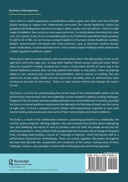 The book is a result of the collaboration between a practicing psychiatrist in a leadership role and the systems engineer. Working together, they demonstrate how to think about redesigning care and redefining the nature of work to enhance value for both the people served and the healthcare workforce. They crafted a multi-pronged approach towards culture change at Sheppard Pratt, including implementing a course on "Learning to Improve," which introduced staff to a performance improvement methodology. There are several vignettes interwoven throughout the book that describe the complexities and constraints of the system. Solving some of these challenges creates a new paradigm of work while minimizing waste and enhancing value.