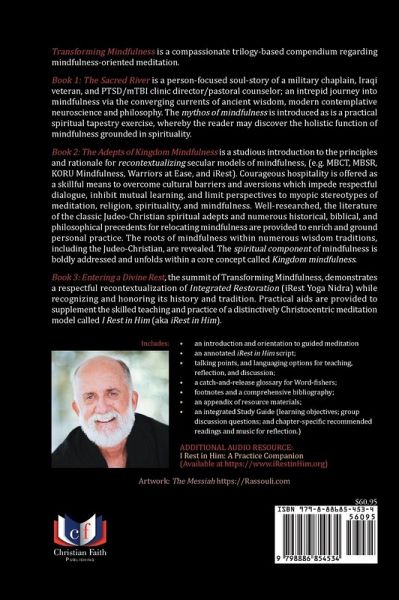 Transforming Mindfulness is a compassionate trilogy-based compendium regarding mindfulness-oriented meditation. Book 1: The Sacred River is a person-focused soul-story of a military chaplain, Iraqi veteran, and PTSD/mTBI clinic director/pastoral counselor; an intrepid journey into mindfulness via the converging currents of ancient wisdom, modern contemplative neuroscience and philosophy. The mythos of mindfulness is introduced as is a practical spiritual tapestry exercise, whereby the reader may discover the holistic function of mindfulness grounded in spirituality. Book 2: The Adepts of Kingdom Mindfulness is a studious introduction to the principles and rationale for recontextualizing secular models of mindfulness, (e.g. MBCT, MBSR, KORU Mindfulness, Warriors at Ease, and iRest). Courageous hospitality is offered as a skillful means to overcome cultural barriers and aversions which impede respectful dialogue, inhibit mutual learning, and limit perspectives to myopic stereotypes of meditation, religion, spirituality, and mindfulness. Well-researched, the literature of the classic Judeo-Christian spiritual adepts and numerous historical, biblical, and philosophical precedents for relocating mindfulness are provided to enrich and ground personal practice. The roots of mindfulness within numerous wisdom traditions, including the Judeo-Christian, are revealed. The spiritual component of mindfulness is boldly addressed and unfolds within a core concept called Kingdom mindfulness. Book 3: Entering a Divine Rest, the summit of Transforming Mindfulness, demonstrates a respectful recontextualization of Integrated Restoration (iRest Yoga Nidra) while recognizing and honoring its history and tradition. Practical aids are provided to supplement the skilled teaching and practice of a distinctively Christocentric meditation model called I Rest in Him (aka iRest in Him). Includes: *an introduction and orientation to guided meditation (model script) an annotated iRest in Him script; talking points, and languaging options for teaching, reflection, and discussion; a catch-and-release glossary for Word-fishers; footnotes and a comprehensive bibliography; an appendix of resource materials; an integrated Study Guide (learning objectives; group discussion questions; and chapter-specific recommended readings and music for reflection.) ADDITIONAL AUDIO RESOURCE (available separately): I Rest in Him: A Practice Companion is a two-part supplemental guide to the iRest in Him practice: Artwork: The Messiah https://Rassouli.com