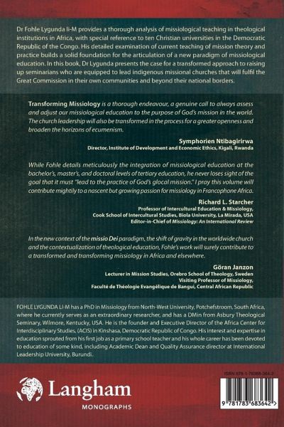 Dr Fohle Lygunda li-M provides a thorough analysis of missiological teaching in theological institutions in Africa, with special reference to ten Christian universities in the Democratic Republic of the Congo. His detailed examination of current teaching of mission theory and practice builds a solid foundation for the articulation of a new paradigm of missiological education. In this book, Dr Lygunda presents the case for a transformed approach to raising up seminarians who are equipped to lead indigenous missional churches that will fulfil the Great Commission in their own communities and beyond their national borders.