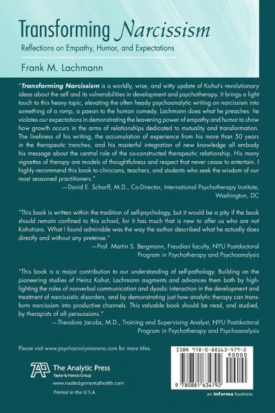 Using Kohut's seminal paper "Forms and Transformations of Narcissism" as a springboard, Frank Lachmann updates Kohut's proposals for contemporary clinicians. Transforming Narcissism: Reflections on Empathy, Humor, and Expectations draws on a wide range of contributions from empirical infant research, psychoanalytic and psychotherapeutic practice, social psychology, and autobiographies of creative artists to expand and modify Kohut's proposition that archaic narcissism is transformed in the course of development or through treatment into empathy, humor, creativity, an acceptance of transience and wisdom. He asserts that empathy, humor, and creativity are not the goals or end products of transformations, but are an intrinsic part of the ongoing therapist-patient dialogue throughout treatment. The transformative process is bidirectional, impacting both patient and therapist, and their affect undergoes transformation - for example from detached to intimate - and narcissism or self-states are transformed secondarily as a consequence of the affective interactions. Meeting or violating expectations of emotional responsivity provides a major pathway for transformation of affect. For beginning therapists, Transforming Narcissism presents an engaging approach to treatment that incorporates the therapeutic action of these transformations, but also leaves room for therapists to develop styles of their own. For more experienced therapists, it fills a conceptual and clinical gap, provides a scaffold for crucial aspects of treatment that are often unacknowledged (because they are not "analytic"), or are dismissed and pejoratively labeled "countertransference." Most importantly, Lachmann offers a balance between therapeutic spontaneity and professional constraint. Focused and engaging, Transforming Narcissism provides a bridge from self psychology to a rainbow of relational approaches that beginning and seasoned therapists can profitably traverse in either direction. Dr. Lachmann contributed to an article on empathy in the April, 2008 issue of O magazine, pp. 230.