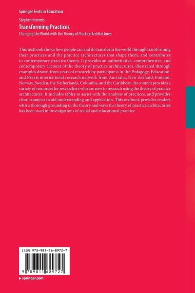 This textbook shows how people can and do transform the world through transforming their practices and the practice architectures that shape them, and contributes to contemporary practice theory. It provides an authoritative, comprehensive, and contemporary account of the theory of practice architectures, illustrated through examples drawn from years of research by participants in the Pedagogy, Education, and Praxis international research network from Australia, New Zealand, Finland, Norway, Sweden, the Netherlands, Colombia, and the Caribbean. Its content provides a variety of resources for researchers who are new to research using the theory of practice architectures. It includes tables to assist with the analysis of practices, and provides clear examples to aid understanding and application. This textbook provides readers with a thorough grounding in the theory and ways the theory of practice architectures has been used in investigations of social and educational practice.