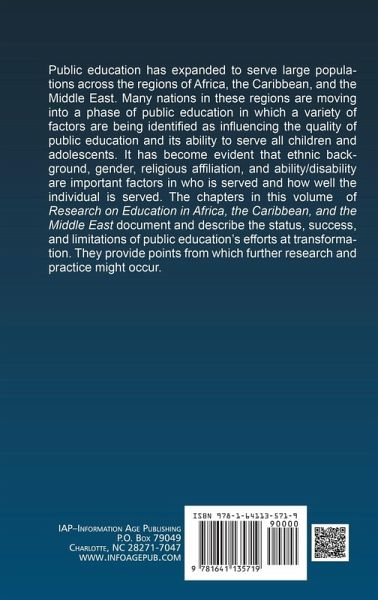 Public education has expanded to serve large populations across the regions of Africa, the Caribbean, and the Middle East. Many nations in these regions are moving into a phase of public education in which a variety of factors are being identified as influencing the quality of public education and its ability to serve all children and adolescents. It has become evident that ethnic background, gender, religious affiliation, and ability/disability are important factors in who is served and how well the individual is served. The chapters in this volume, Book 8, of Research on Education in Africa, the Caribbean, and the Middle East document and describe the status, success, and limitations of public education's efforts at transformation. They provide points from which further research and practice might occur.