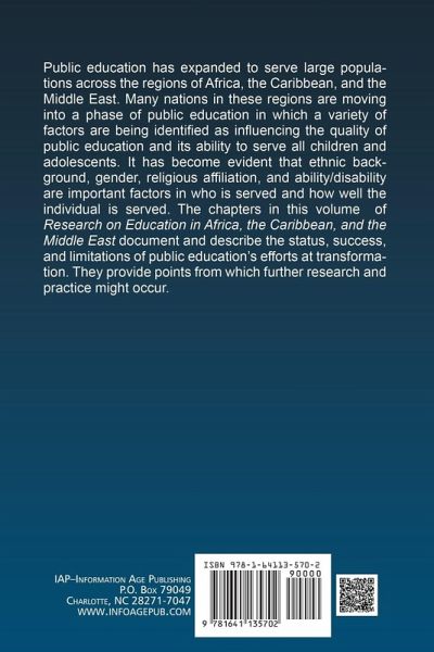Public education has expanded to serve large populations across the regions of Africa, the Caribbean, and the Middle East. Many nations in these regions are moving into a phase of public education in which a variety of factors are being identified as influencing the quality of public education and its ability to serve all children and adolescents. It has become evident that ethnic background, gender, religious affiliation, and ability/disability are important factors in who is served and how well the individual is served. The chapters in this volume, Book 8, of Research on Education in Africa, the Caribbean, and the Middle East document and describe the status, success, and limitations of public education's efforts at transformation. They provide points from which further research and practice might occur.
