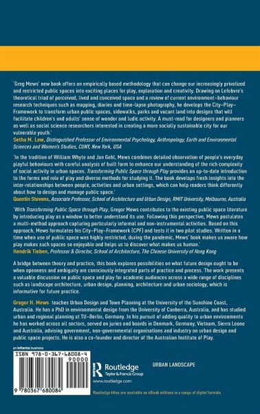 'In the tradition of William Whyte and Jan Gehl, Mews combines detailed observation of people's everyday playful behaviours with careful analysis of built form to enhance our understanding of the rich complexity of social activity in urban spaces. Transforming Public Space through Play provides an up-to-date introduction to the forms and role of play and diverse methods for studying it. The book develops fresh insights into the inter-relationships between people, activities and urban settings, which can help readers think differently about how to design and manage public space.'