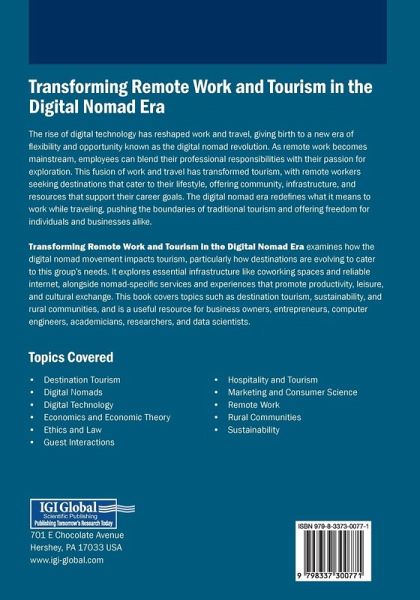 The rise of digital technology has reshaped work and travel, giving birth to a new era of flexibility and opportunity known as the digital nomad revolution. As remote work becomes mainstream, employees can blend their professional responsibilities with their passion for exploration. This fusion of work and travel has transformed tourism, with remote workers seeking destinations that cater to their lifestyle, offering community, infrastructure, and resources that support their career goals. The digital nomad era redefines what it means to work while traveling, pushing the boundaries of traditional tourism and offering freedom for individuals and businesses alike. Transforming Remote Work and Tourism in the Digital Nomad Era examines how the digital nomad movement impacts tourism, particularly how destinations are evolving to cater to this group s needs. It explores essential infrastructure like coworking spaces and reliable internet, alongside nomad-specific services and experiences that promote productivity, leisure, and cultural exchange. This book covers topics such as destination tourism, sustainability, and rural communities, and is a useful resource for business owners, entrepreneurs, computer engineers, academicians, researchers, and data scientists.
