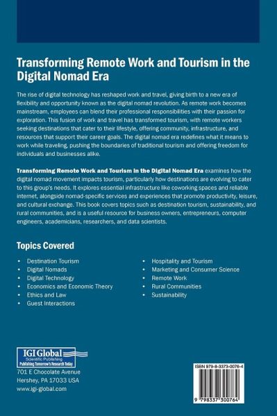 The rise of digital technology has reshaped work and travel, giving birth to a new era of flexibility and opportunity known as the digital nomad revolution. As remote work becomes mainstream, employees can blend their professional responsibilities with their passion for exploration. This fusion of work and travel has transformed tourism, with remote workers seeking destinations that cater to their lifestyle, offering community, infrastructure, and resources that support their career goals. The digital nomad era redefines what it means to work while traveling, pushing the boundaries of traditional tourism and offering freedom for individuals and businesses alike. Transforming Remote Work and Tourism in the Digital Nomad Era examines how the digital nomad movement impacts tourism, particularly how destinations are evolving to cater to this group s needs. It explores essential infrastructure like coworking spaces and reliable internet, alongside nomad-specific services and experiences that promote productivity, leisure, and cultural exchange. This book covers topics such as destination tourism, sustainability, and rural communities, and is a useful resource for business owners, entrepreneurs, computer engineers, academicians, researchers, and data scientists.