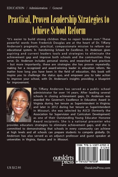 Eliminating Achievement Gaps: Accountability in Charter and Traditional Public Schools is a book that will compel any educator to take action to improve schools now. The book is filled with practical strategies aimed at eliminating achievement gaps and improving performance in charter and traditional public schools. The author, Dr. Tiffany Anderson, is a national motivational speaker and a distinguished educator who served as a superintendent for charter and traditional public schools. She shares proven strategies and forms leaders can duplicate for their schools. The book dispels myths about obstacles to high performance in schools and focuses on the high performance that all schools can achieve. This is also a great handbook for leadership courses in post-secondary settings.