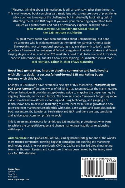 Changes in B2B buying have heralded a new age of B2B marketing. Transforming the B2B Buyer Journey offers a new way of thinking that accommodates the many nuances in buyer behaviour. It provides a step-by-step guide to mapping the buyer journey, aligning channels, metrics and tactics according to their needs at each stage. The framework shows how to get more value out of brand investments, choosing and using technology and how to gauge return on investment. It also shows how to develop marketing as a real lever for business growth and how to reengineer marketing's relationship with sales.