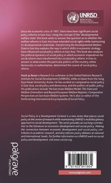 Since the economic crisis of 1997, there have been significant social policy reforms in East Asia. Using the concept of the developmental welfare state, this book seeks to answer whether the welfare reforms in East Asia have extended social rights while maintaining its developmental credentials. Transforming the Developmental Welfare State in East Asia explains the way in which the shift in economic strategy has influenced social policy reform in East Asia. It also analyzes the political dynamics of social policy in which economic imperatives for social reform were transformed into social policy reform.